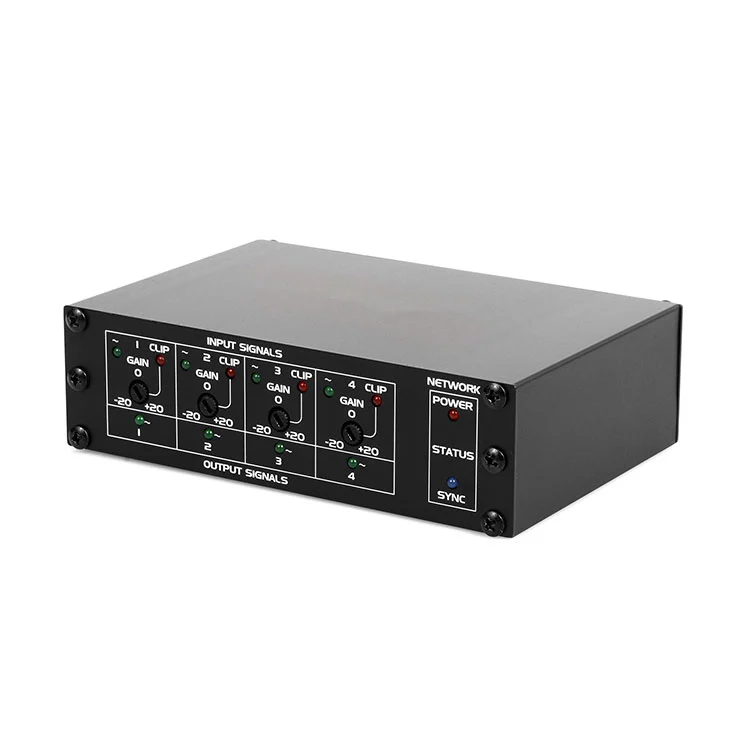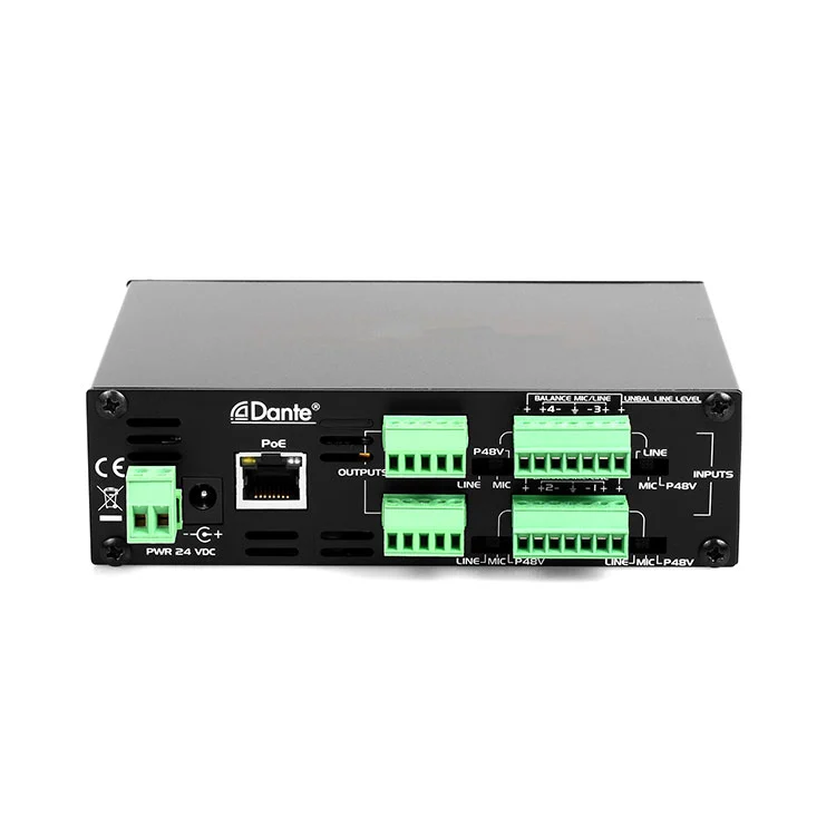 4 MIC და ხაზის შეყვანა Dante ინტერფეისი არის პროფესიონალური აუდიო ინტერფეისი, რომელიც დაფუძნებულია Dante ქსელის პროტოკოლზე, რომელიც მხარს უჭერს 4 მიკროფონის/ხაზის შეყვანას და 4 გამოსავალს. მისი ძირითადი უპირატესობაა მაღალი ხარისხის, დაბალი ლატენტური აუდიო სიგნალების გადაცემა IP ქსელების საშუალებით, რაც შესაფერისია სცენარებისთვის, რომლებიც საჭიროებენ მოქნილ გაყვანილობას, დისტანციურ გადაცემას ან მრავალარხიანი აუდიო ინტეგრაციას.